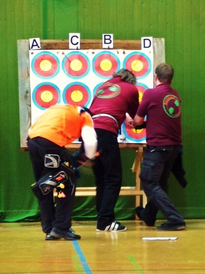 Das Pfeileziehen war für so manchen Compoundschützen ein richtiger Kraftakt....zwei Mann hatten Mühe, die Pfeile aus der Scheibe zu hebeln.